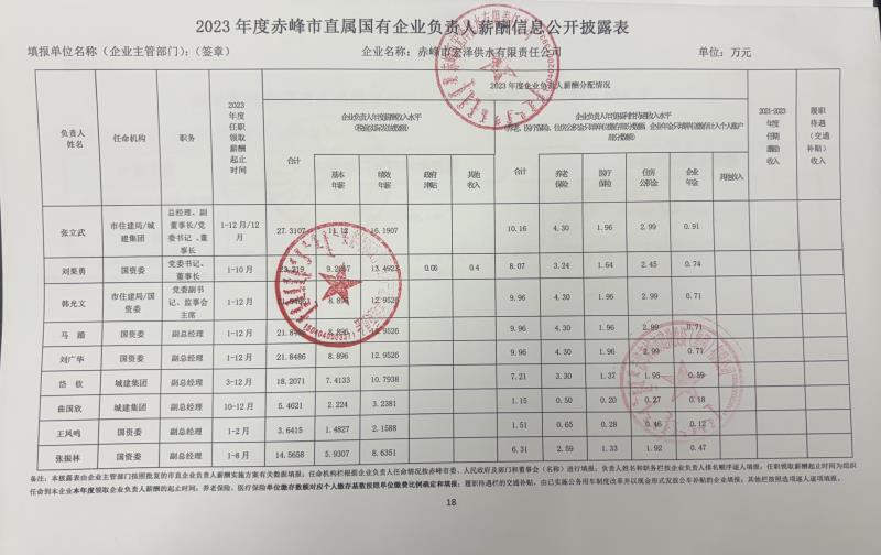 2023年度赤峰市直屬國有企業(yè)負責人薪酬(赤峰市宏澤供水有限責任公司)