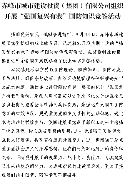 赤峰市城市建設(shè)投資(集團(tuán))有限公司組織開展“強(qiáng)國(guó)復(fù)興有我”國(guó)防知識(shí)競(jìng)答活動(dòng)