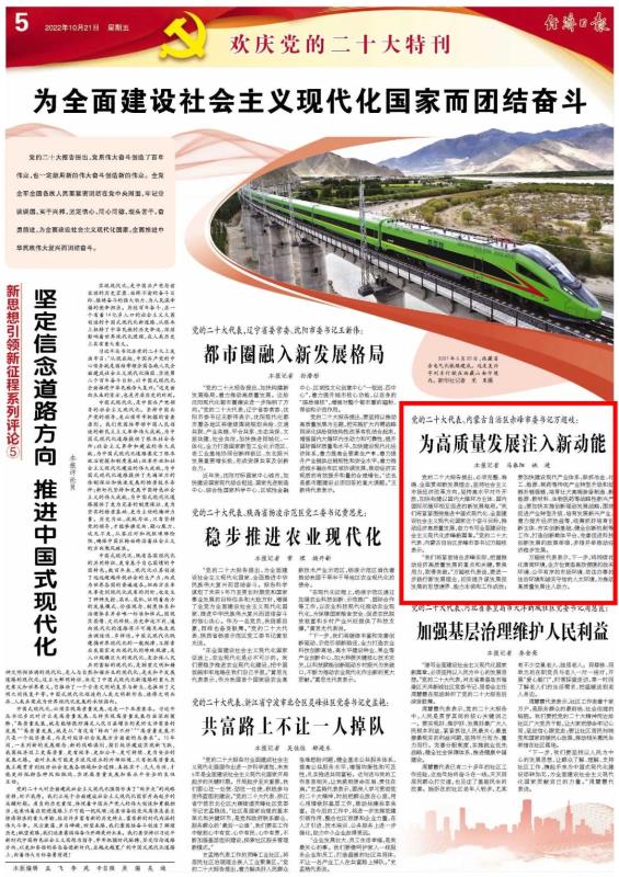 黨的二十大報(bào)告提出,必須完整、準(zhǔn)確、全面貫徹新發(fā)展理念,堅(jiān)持社會主義市場經(jīng)濟(jì)改革方向,堅(jiān)持高水平對外開放,加快構(gòu)建以國內(nèi)大循環(huán)為主體、國內(nèi)國際雙循環(huán)相互促進(jìn)的新發(fā)展格局。“我們將緊緊圍繞推進(jìn)中國式現(xiàn)代化、全面建設(shè)社會主義現(xiàn)代化國家這個(gè)奮斗目標(biāo),推動經(jīng)濟(jì)高質(zhì)量發(fā)展,奮力書寫全面建設(shè)社會主義現(xiàn)代化赤峰新篇章?!秉h的二十大代表、內(nèi)蒙古自治區(qū)赤峰市委書記萬超岐表示。